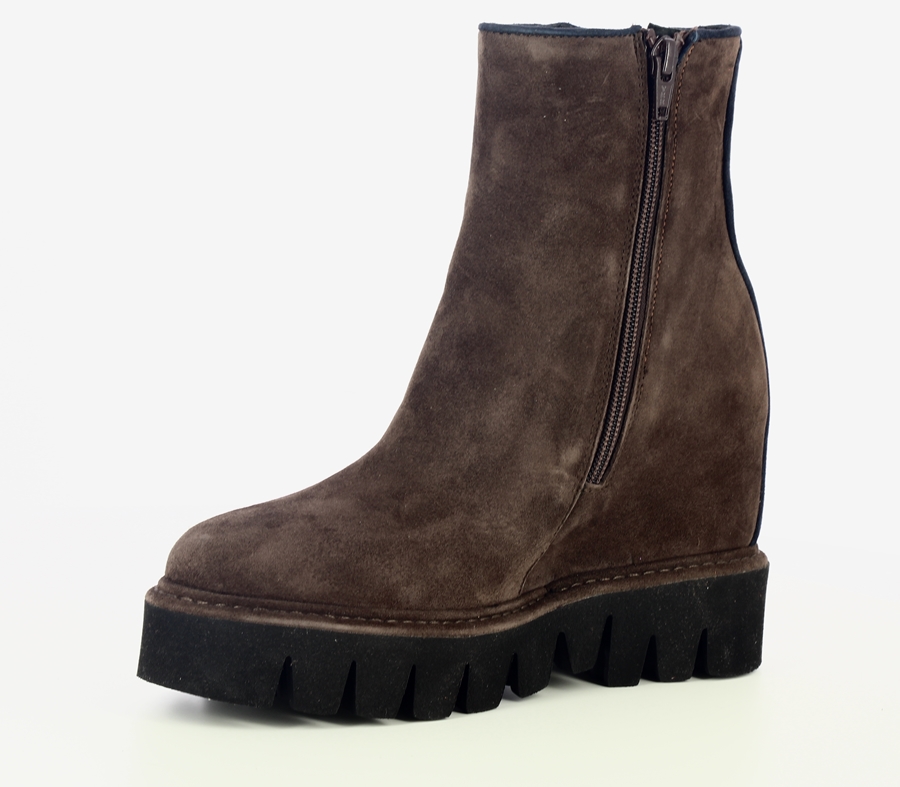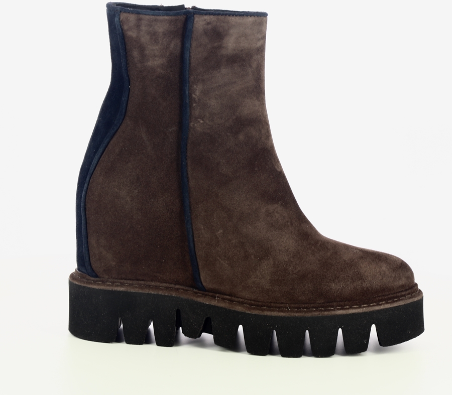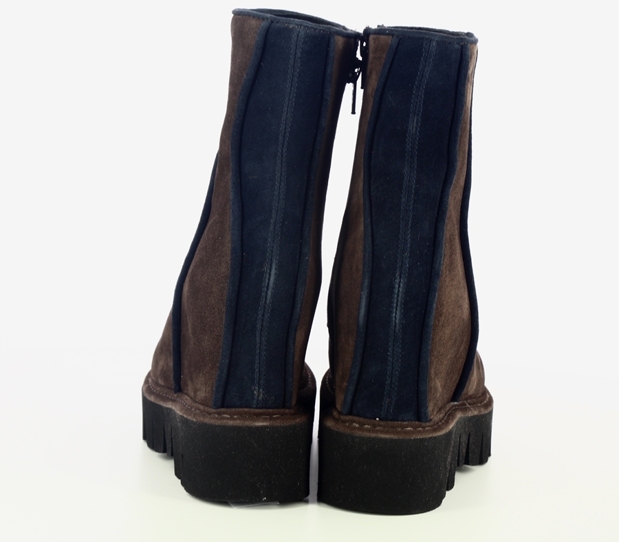 DETTAGLIO: Stivaletto con punta stondata e design pulito. Presenta una zeppa interna per un maggiore comfort e dettagli laterali in camoscio blu a contrasto. Zip laterale. La suola carrarmato aggiunge carattere e aderenza.