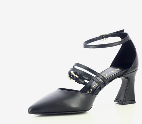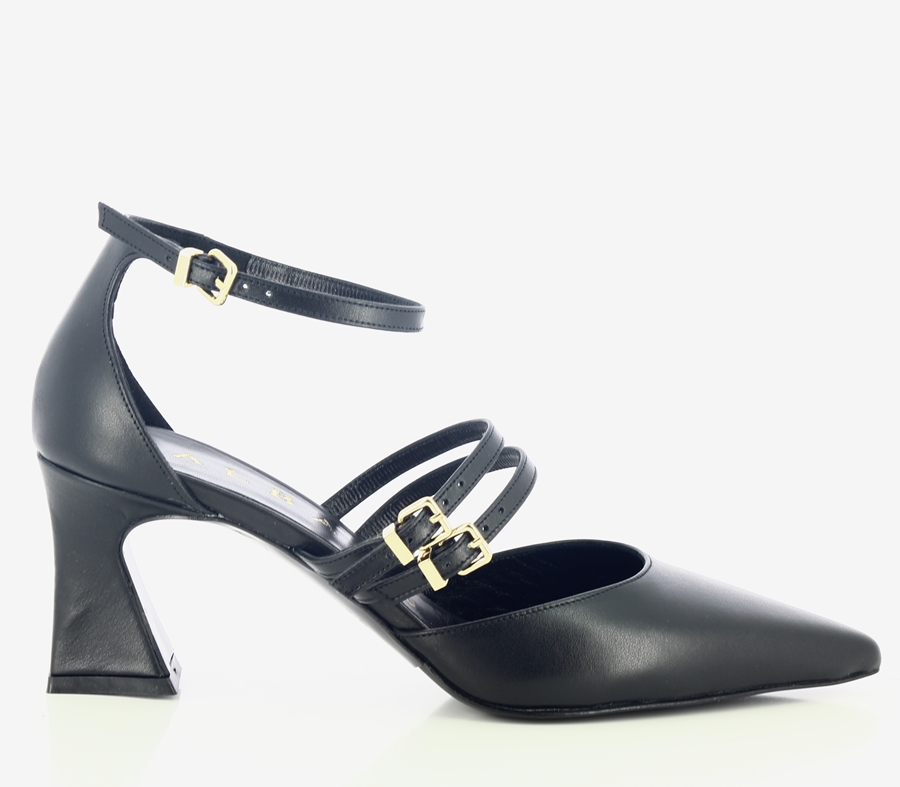 DETTAGLIO: Décolleté silhouette affusolata e doppio cinturino con fibbia sul collo del piede. Presenta un cinturino regolabile alla caviglia con fibbia e un tacco a clessidra. Design elegante per occasioni speciali.