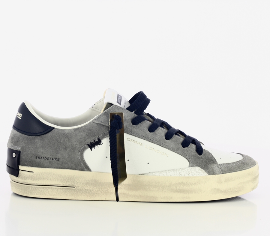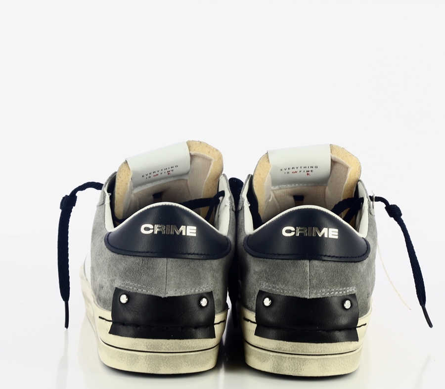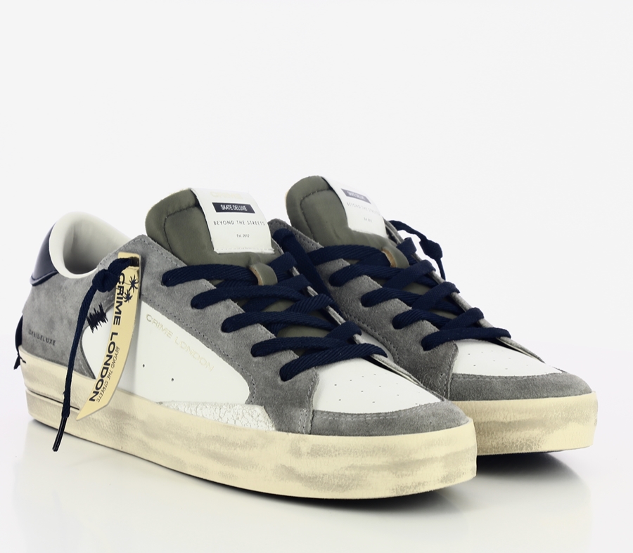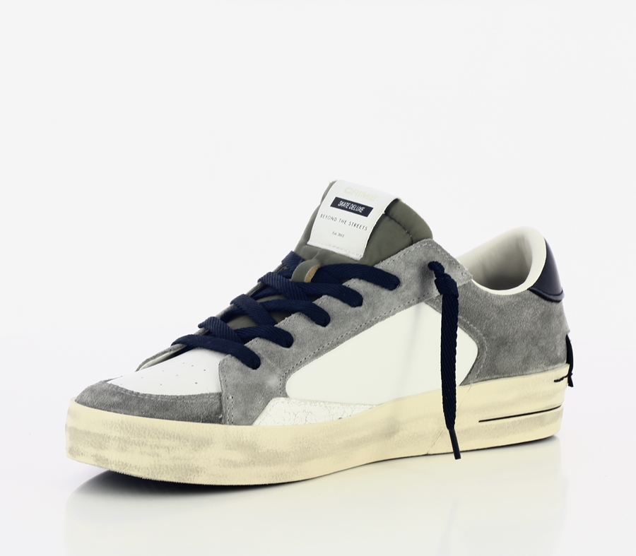 Tomaia in suede cemento, dettagli in cracklé bianco