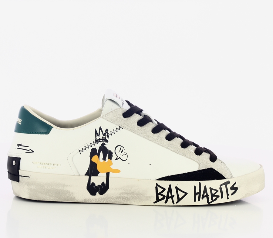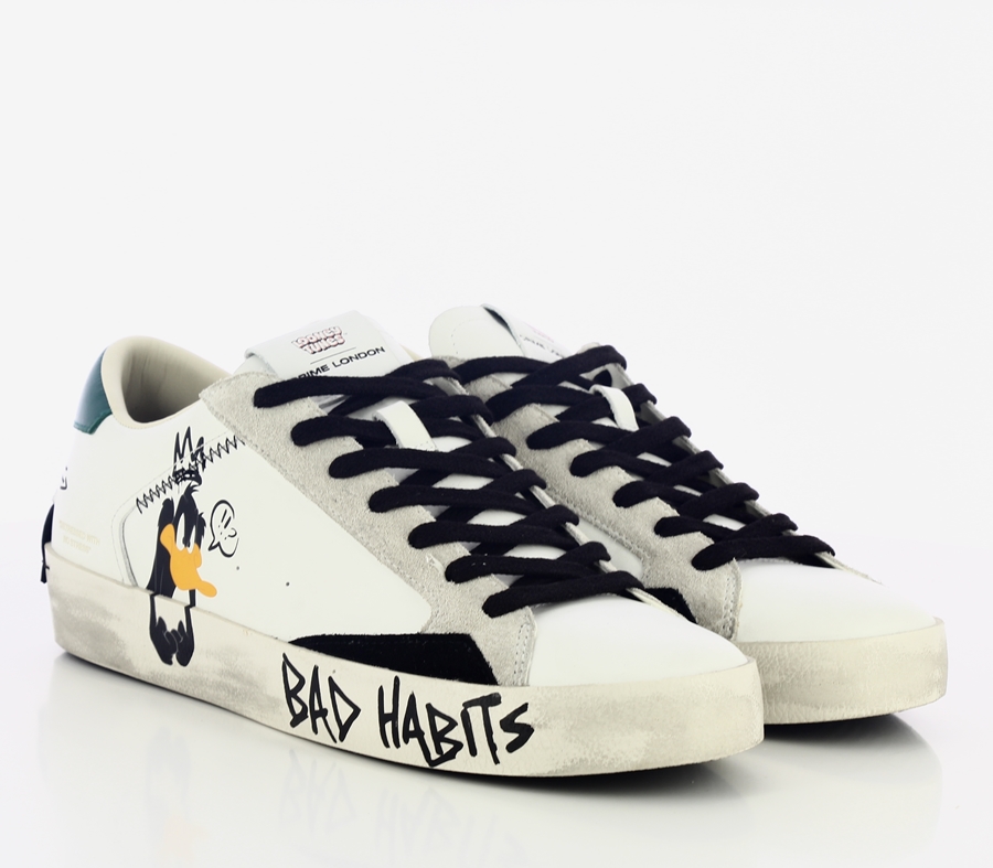Tomaia in pelle bianca con stampa Duffy Duck, dettagli in suede grigio e nero