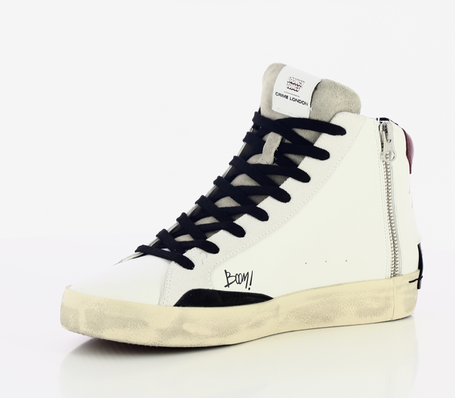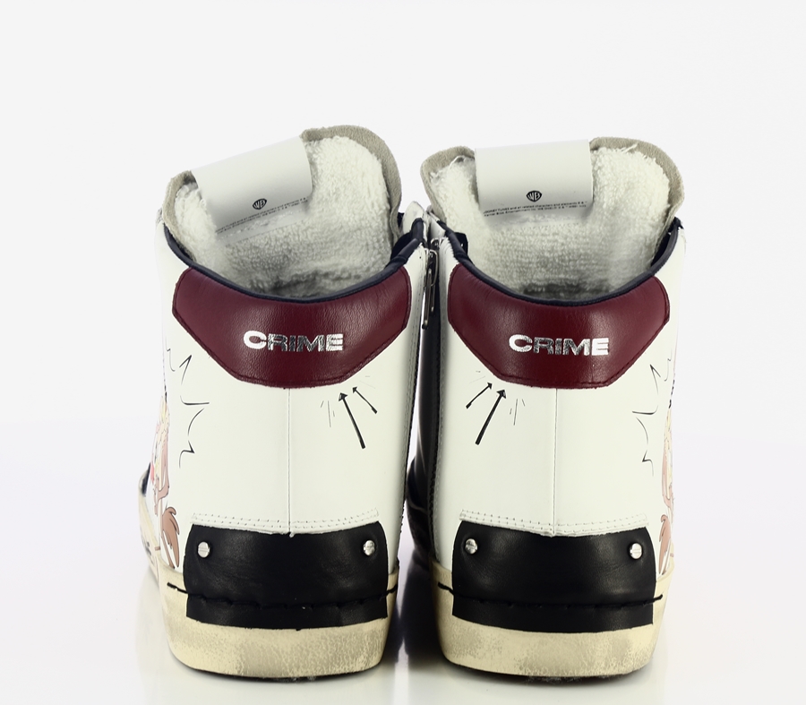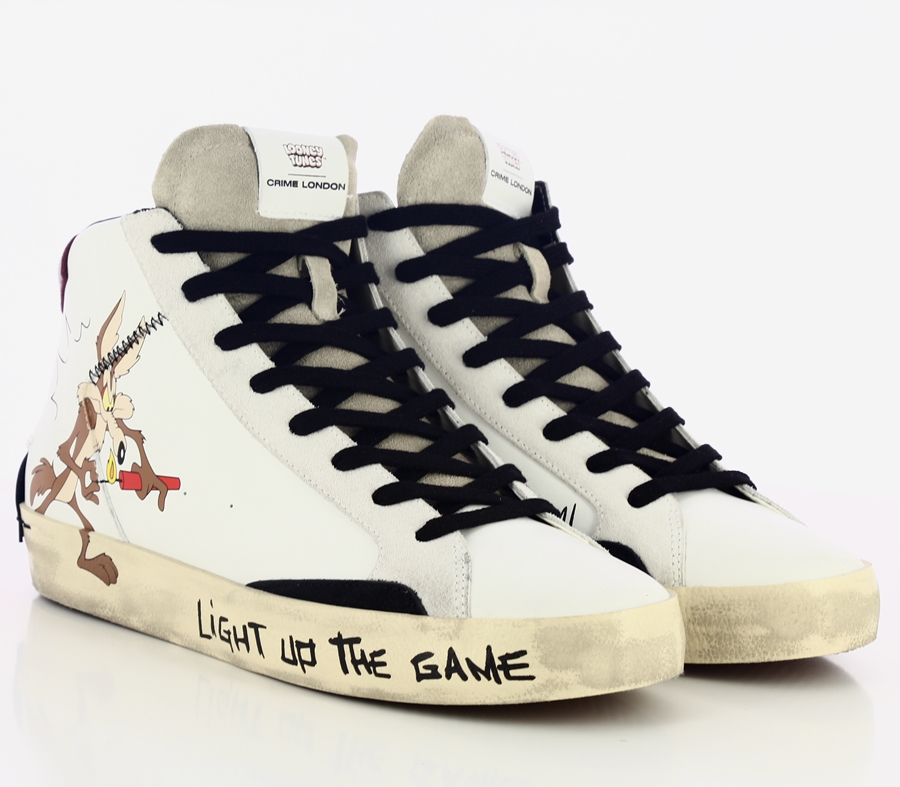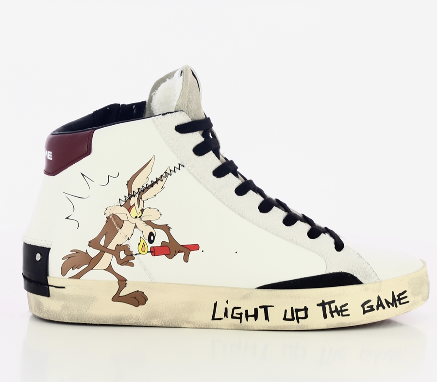 Tomaia in pelle bianca con stampa Wile E. Coyote, dettagli in suede bianco e nero
