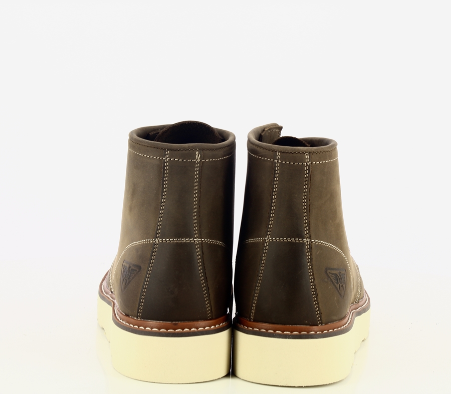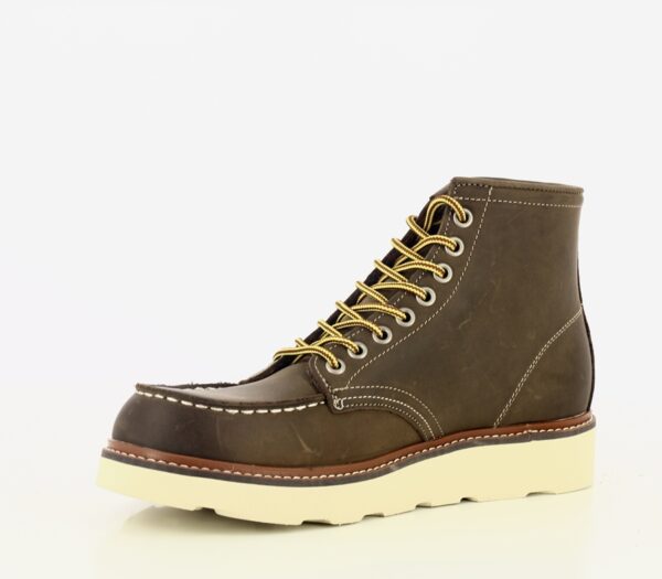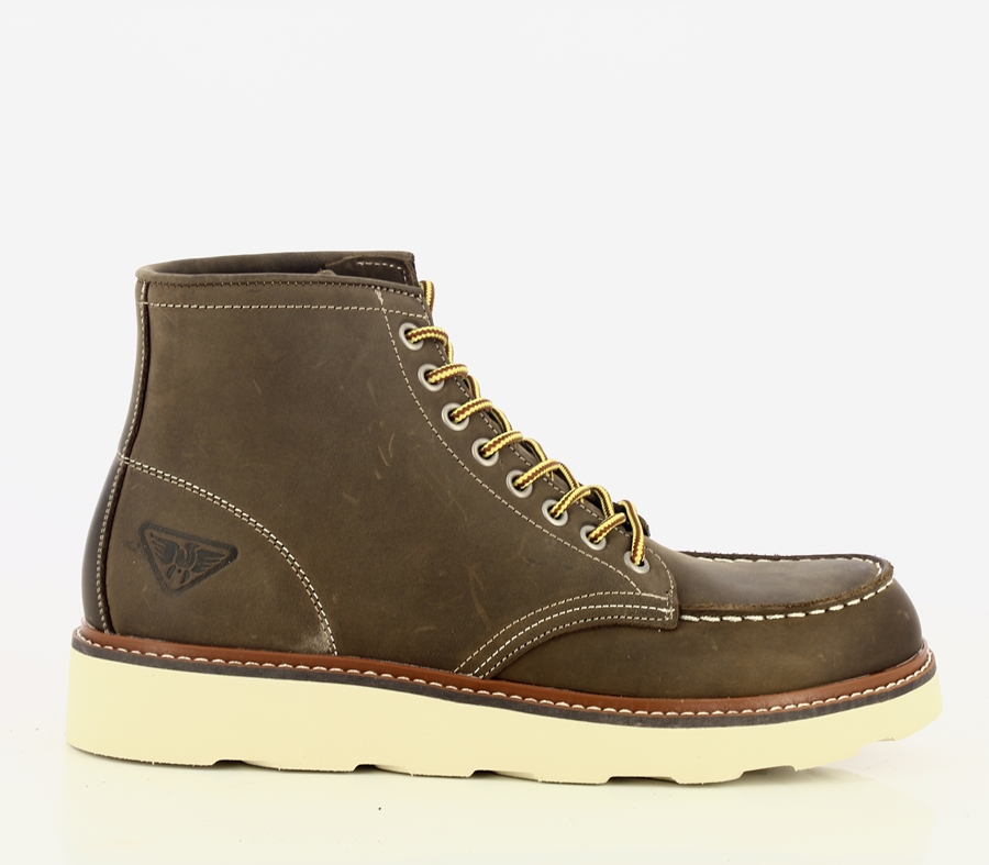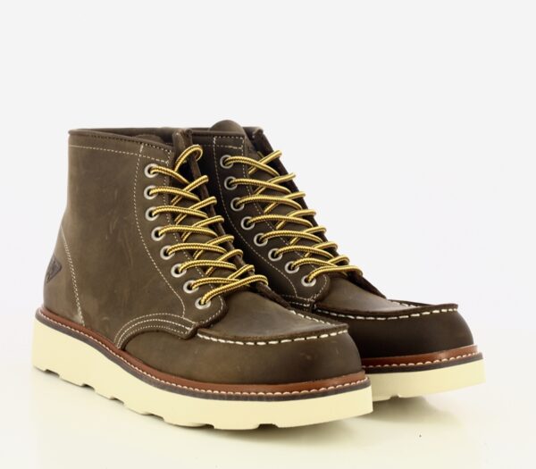 DETTAGLIO: Tronchetto in stile work-boot stringato .Punta squadrata con cucitura frontale, e cuciture a contrasto. L’allacciatura è dotata di occhielli metallici. Il guardolo a vista aggiunge un tocco di robustezza. Suola in gomma. Logo in rilievo sul lato esterno.
