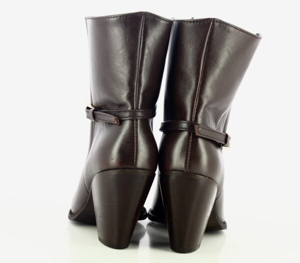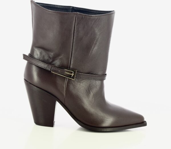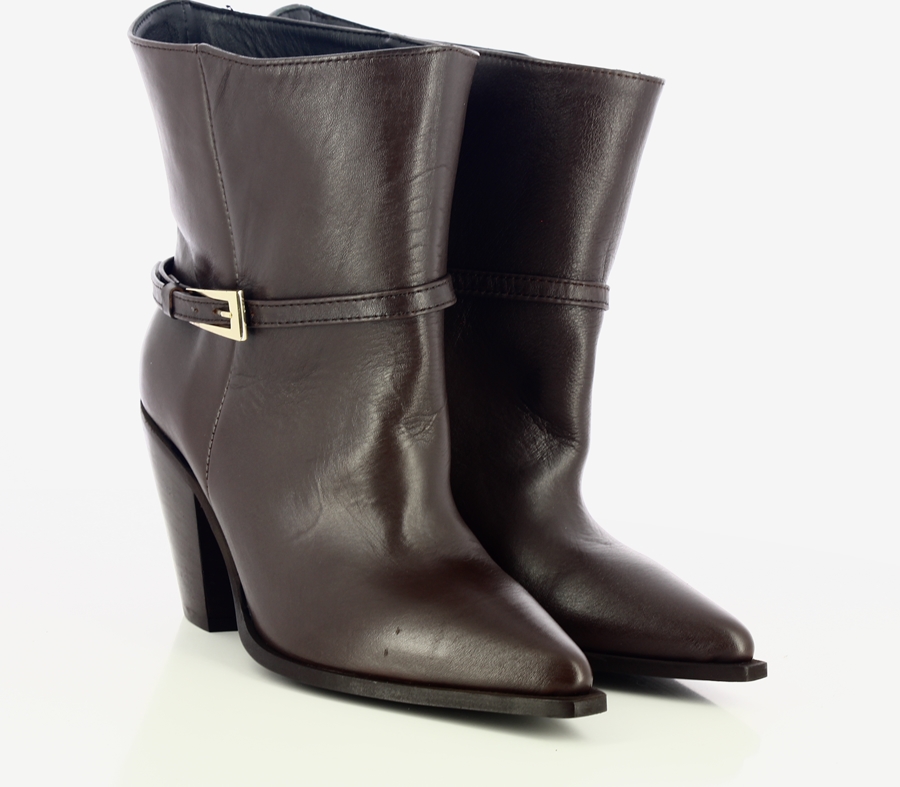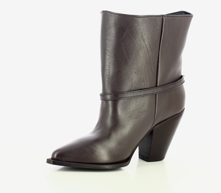 DETTAGLIO: Tronchetto in pelle,gambale tubo. Dotato di cinturino con fibbia metallica sul gambale. Presenta un tacco conico e una punta affusolata. Il design elegante e versatile lo rende perfetto per diverse occasioni.