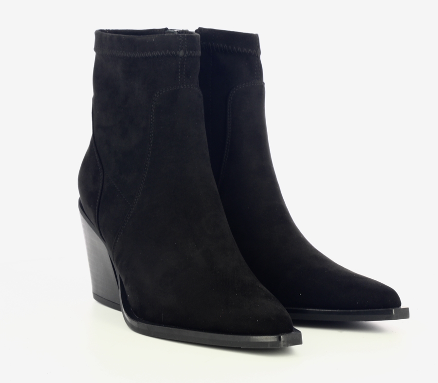 DETTAGLIO: Tronchetto con punta sfilata e un tacco leggermente inclinato, di ispirazione western.Gambale elasticizzato in eco pelle scamosciata,che offre una vestibilità aderente e avvolgente. Il design è pulito per un look minimalista ed elegante. Ideale per un outfit di tendenza.