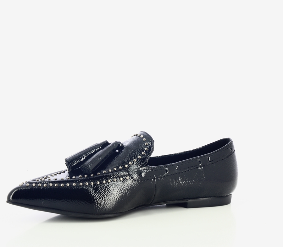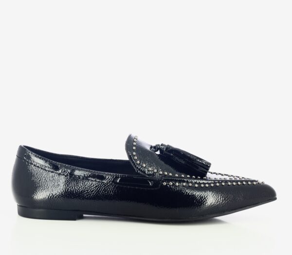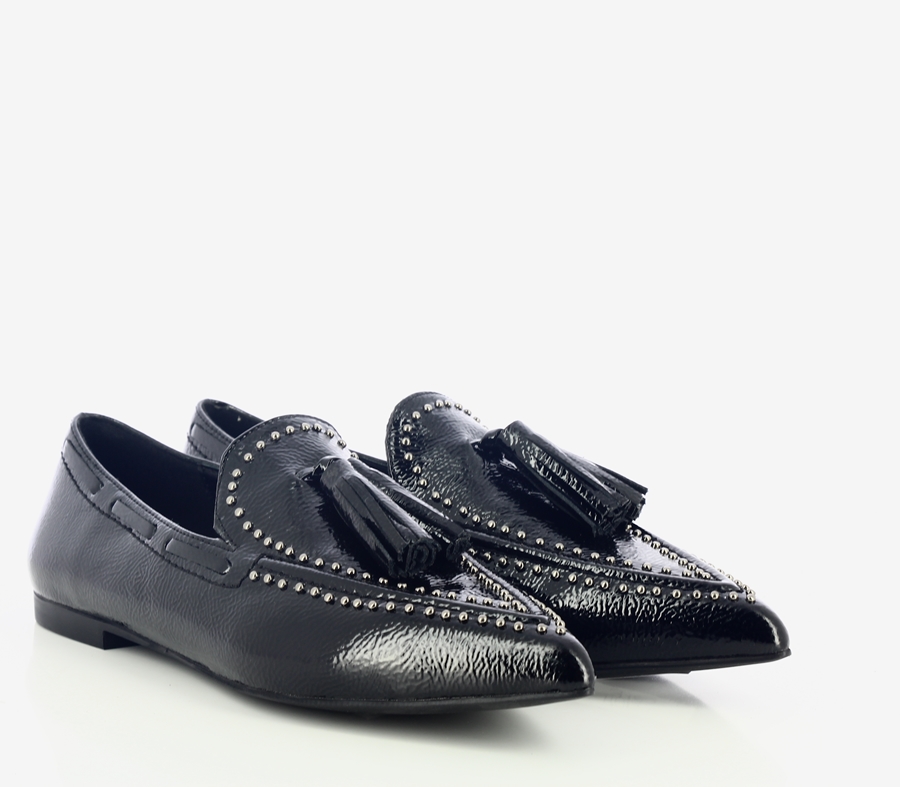 DETTAGLIO: Mocassino dalla silhouette affusolata. La tomaia è impreziosita da borchie decorative e nappe. Eleganza e carattere si fondono in un unico accessorio di tendenza.