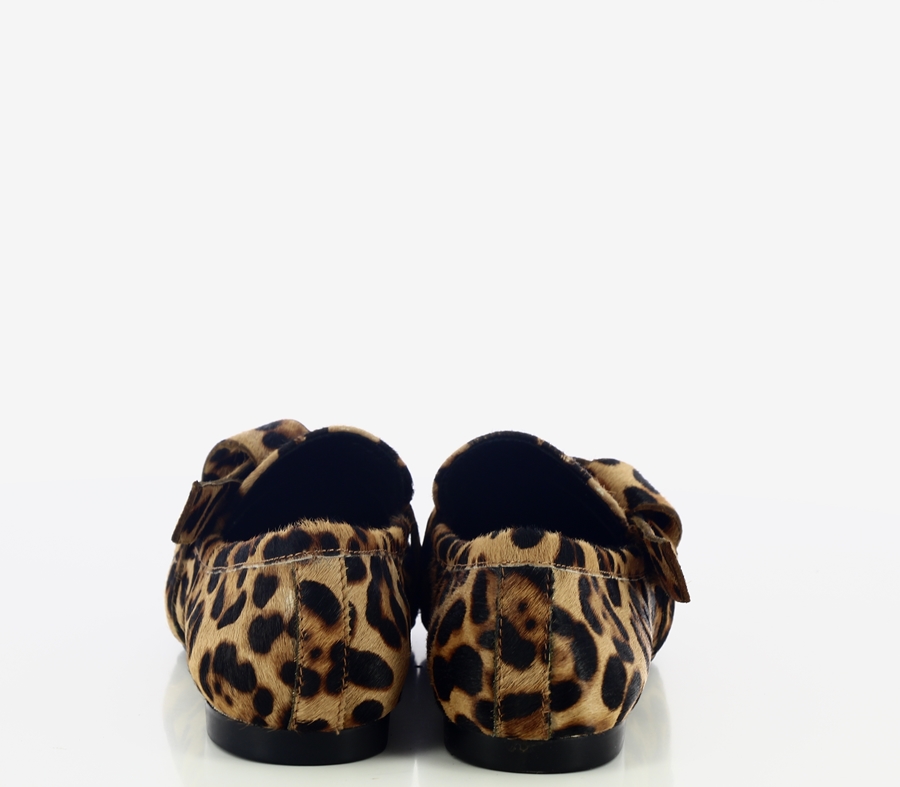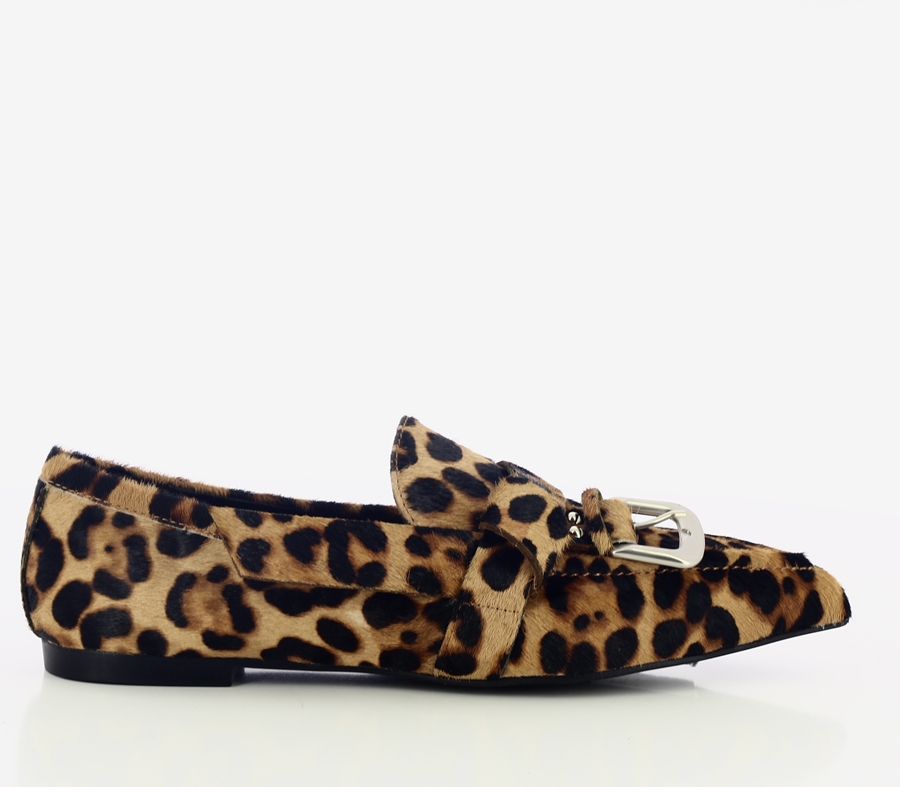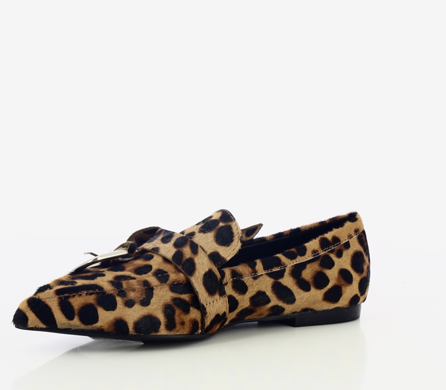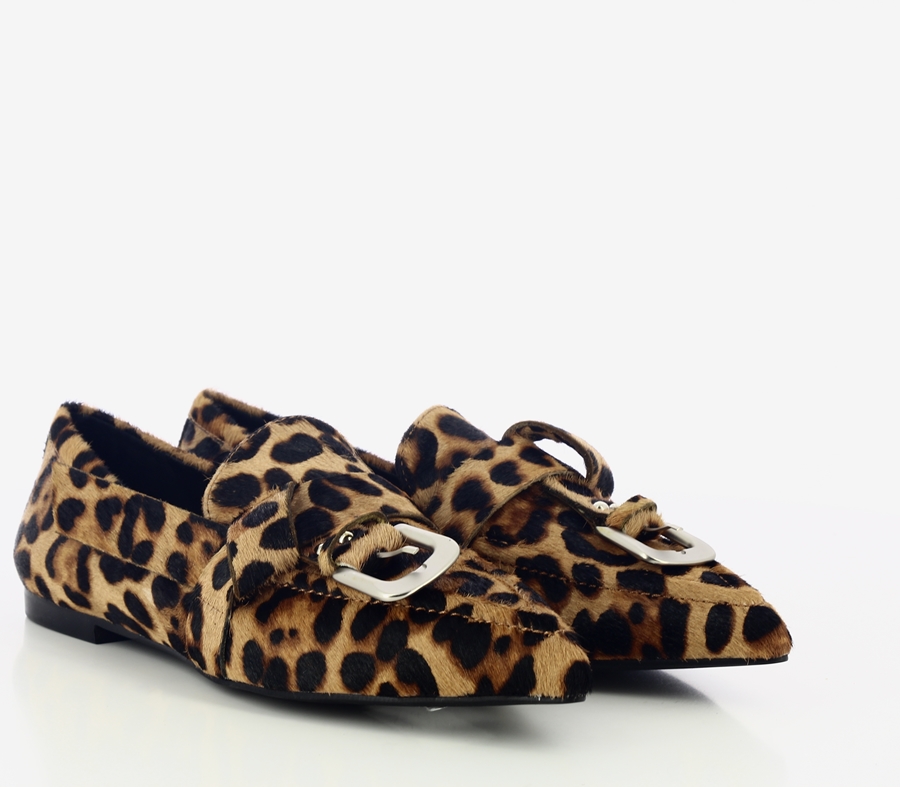 DETTAGLIO: Mocassino dalla silhouette affusolata realizzato in pony maculato. Fibbia argentata sulla tomaia che aggiunge un tocco di stile. Ideale per un look di tendenza.