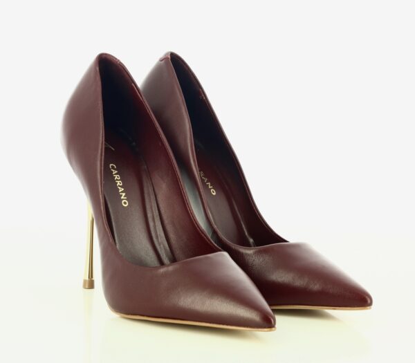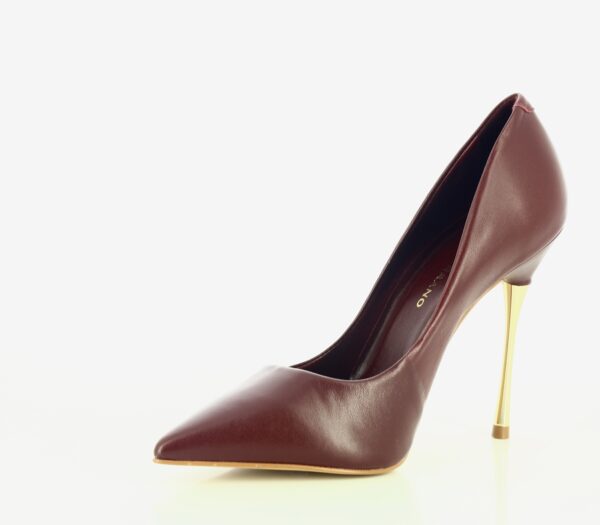 DETTAGLIO: Décolleté elegante con punta affusolata e Il tacco è a spillo metallico in finitura oro, che aggiunge un tocco di raffinatezza.