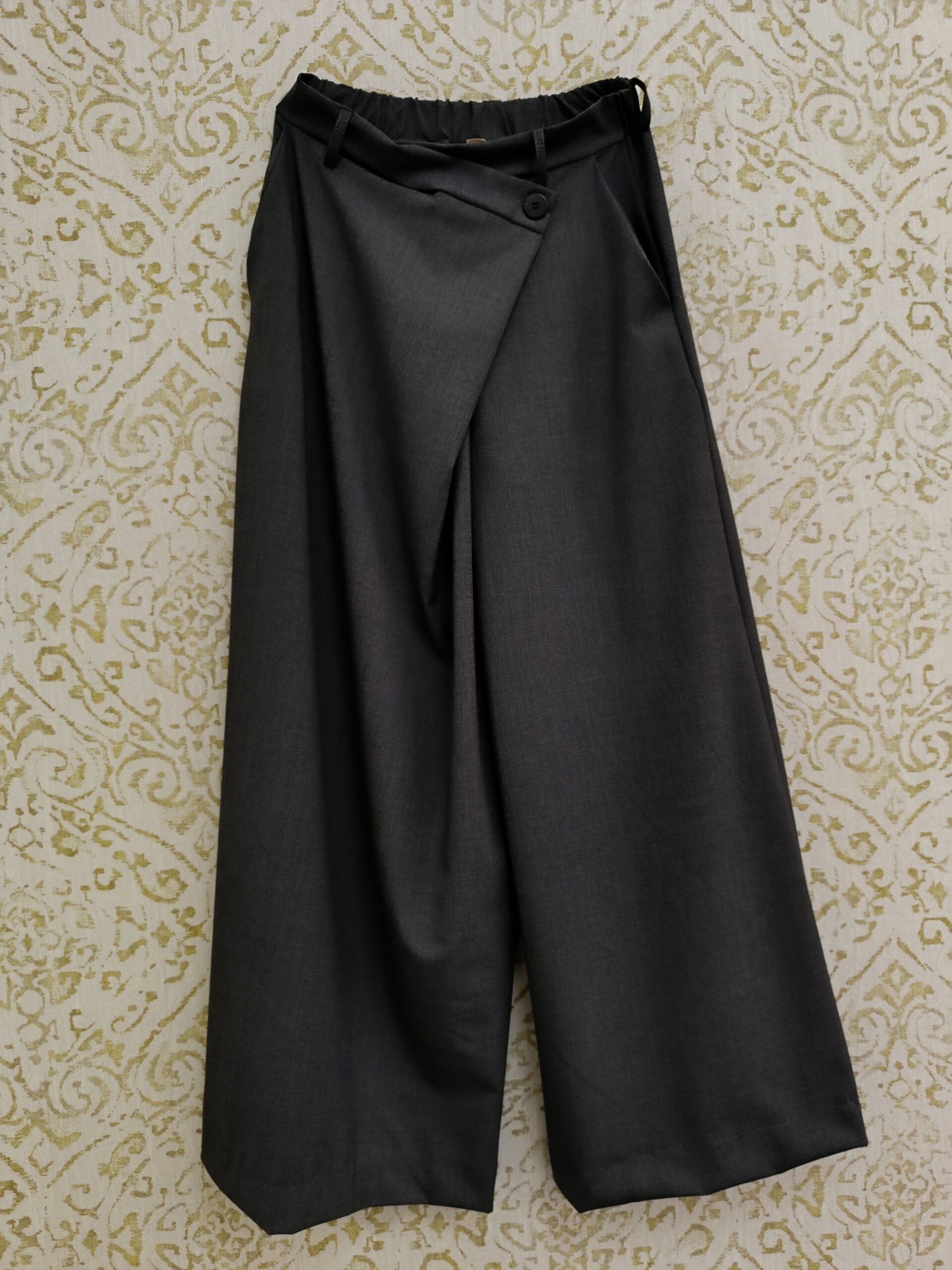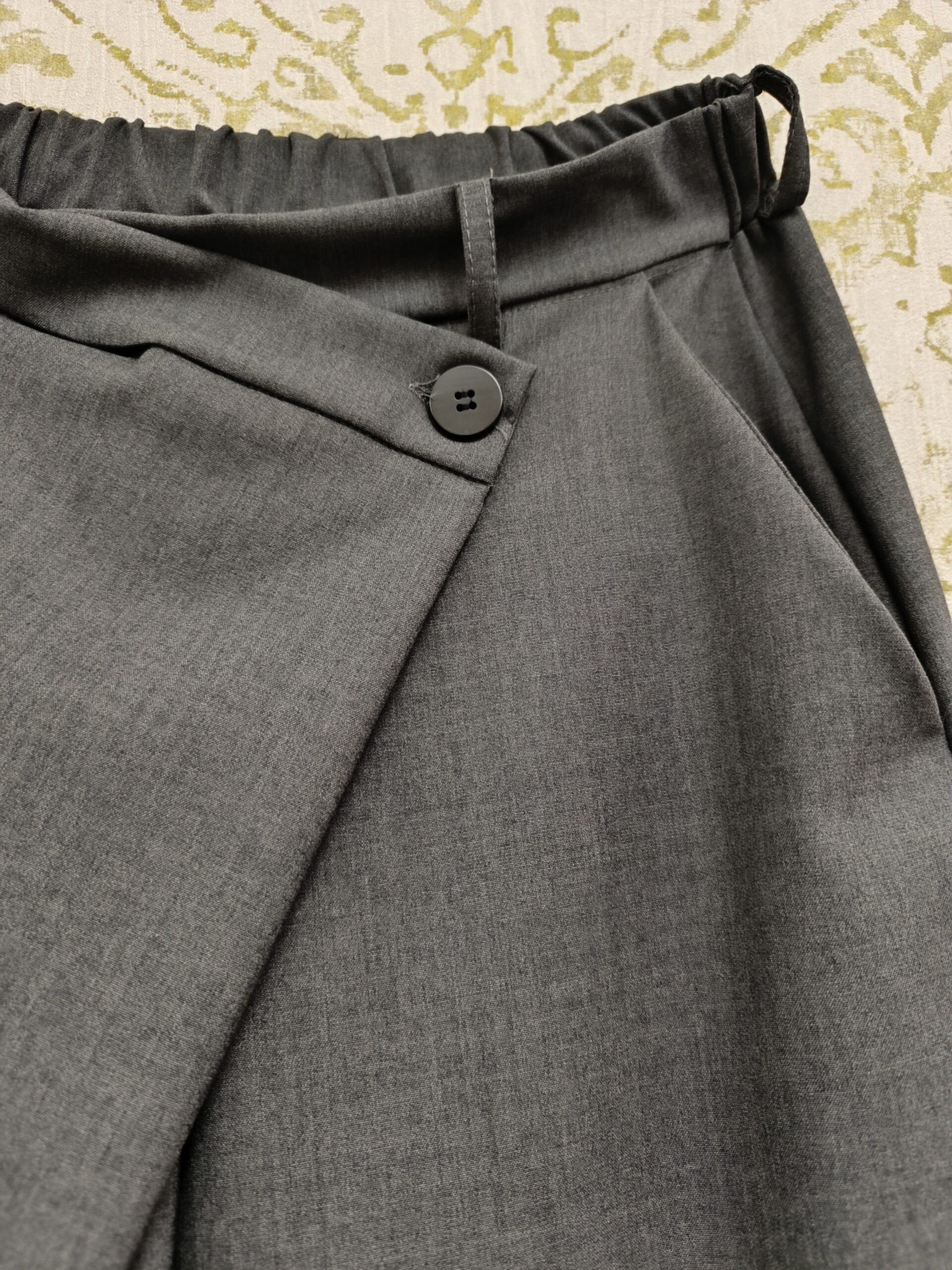 Pantaloni eleganti in tessuto. Patta obliqua con bottone.Tasche laterali oblique. Gamba ampia .