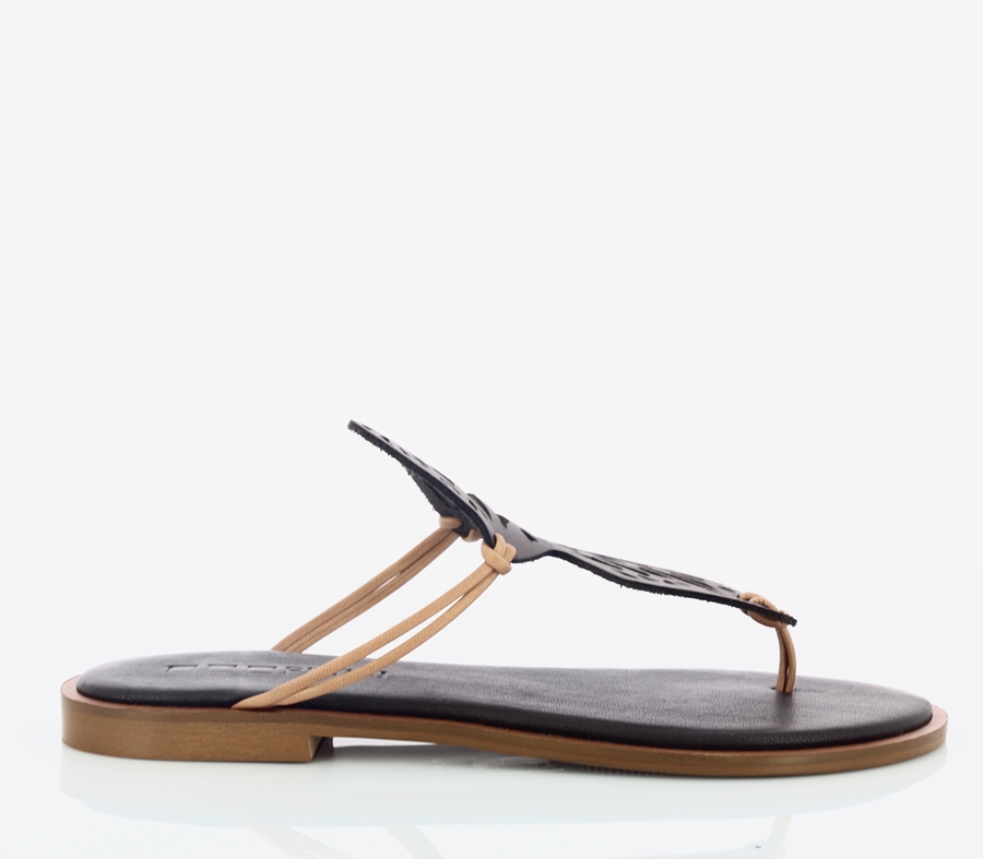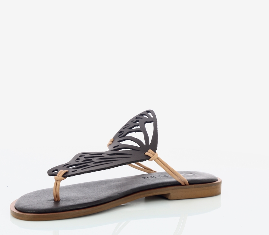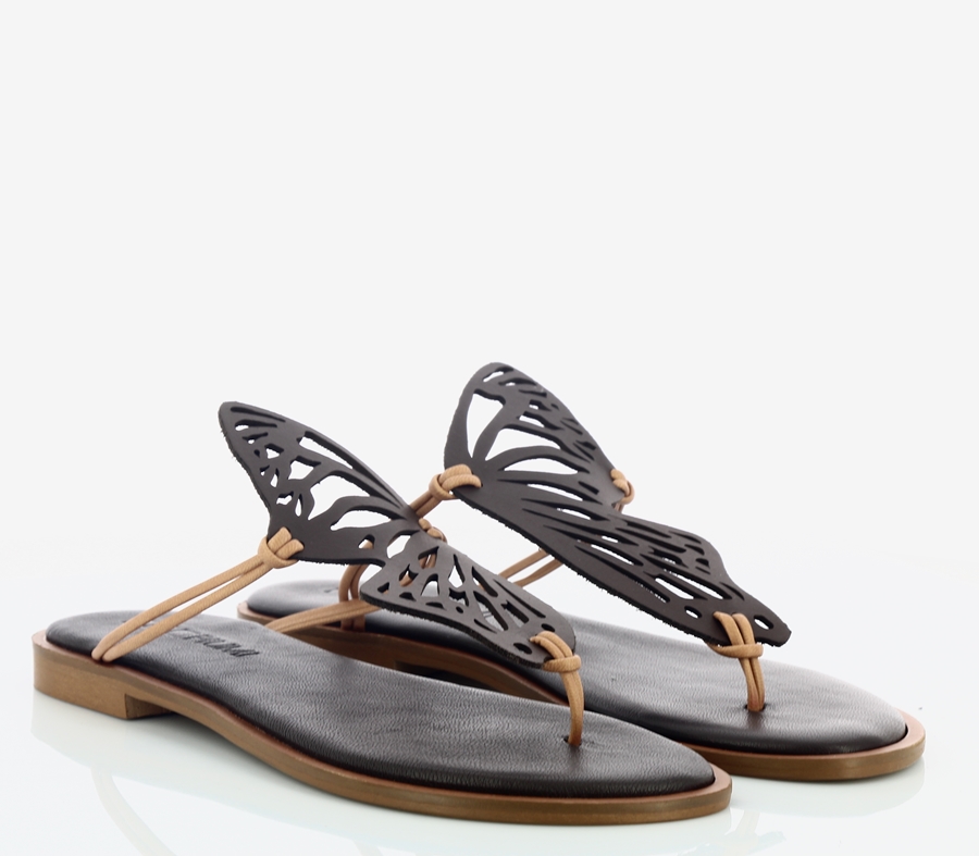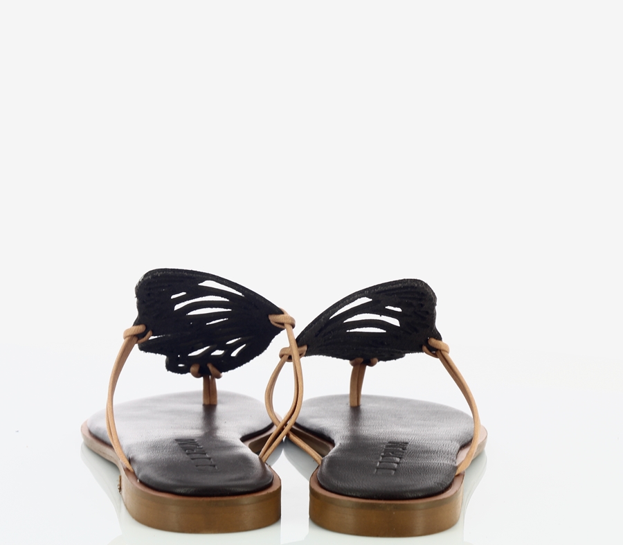 Sandalo infradito flat. Caratterizzato da un'applicazione a forma di farfalla traforata che copre il collo del piede e da fascette sottili e sinuose che ne completano l'allacciatura. Ideale per un look estivo fresco e alla moda.Made in Italy